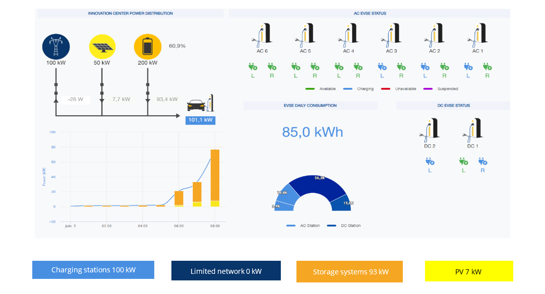 Pour faire du Centre d’innovation un véritable bâtiment intelligent, Socomec a conçu une infrastructure électrique et de contrôle complète connectant l’ensemble des équipements de la solution de prosommation, c’est-à-dire les panneaux PV, le BESS, les chargeurs de VE et la connexion au réseau, à une plateforme de surveillance cloud unique : SoLive PRO.