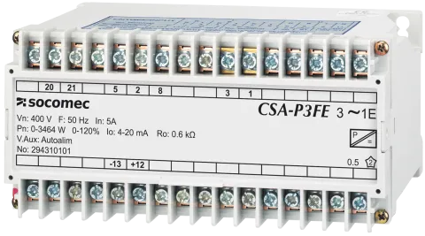 | Description | Transducteur CSA-P4FNE entrée : 400V, 5A sortie : 4-20 mA, 0-10 VDC, 230 VAC alimentation auxiliaire Transducteur convertit un paramètre électrique en un signal DC |