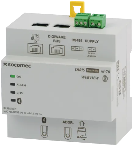 | 48290222 | M-70 | Communication gateway interface for DIRIS Digiware system | Modbus RTU - Modbus TCP - SNMP v1, v2, v3 & Traps - BACnet IP - HTTP(S) - FTP(S) - SMTP(S) - Bluetooth Low Energy | RS485 - Ethernet - Digiware - USB |