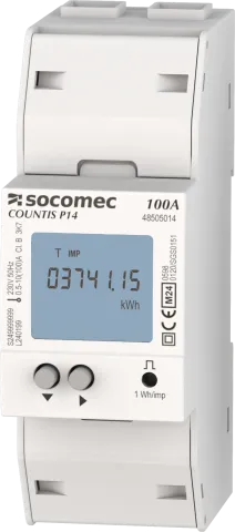 | Description | Compteur d’énergie active modulaire COUNTIS P14 certifiés MID Monophasé - direct 100A, protocoles électriques de type MODBUS, totalement intégrés à l'écosystème SOCOMEC comprenant : Webview/écrans/passerelles/logiciel de configuration |